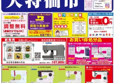 11月2日より、大幅値引き!大特価市!!を開催します! 期間中はお得になる商品を大放出!! 台数限定のお買い得品あり♪♪早い者勝ちですのでお早めにご来店ください☆ はじめてミシンを挑戦される方も、ミシ...