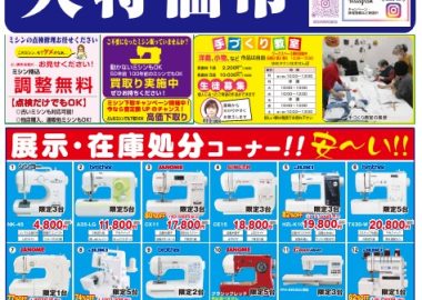 12月17日より、大幅値引き!大特価市!!を開催中! 期間中はお得になる商品を大放出!! 展示・在庫処分コーナー、台数限定のお買い得品あり♪♪早い者勝ちですのでお早めにご来店ください☆ はじめてミシン...